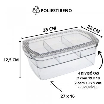 Organizador Retangular Diamante com Divisórias O Organizador retangular da linha diamante Crystal irá te auxiliar no armazenamento dos itens que desejar, pois conta com o design sofisticado e amplo espaço com 4 divisórias na parte de cima e mais uma amplo espaço na parte de baixo. Mantendo seus objetos organizados e facilmente transportáveis com a caixa organizadora multiuso confeccionada em poliestireno. Com seu design resistente e durável, esta caixa é ideal para armazenar variedades de objetos como: óculos, relógios, material de escritório, escolar, bijuterias, maquiagens, medicamentos, material de costura, entre outros. É perfeita para organização de produtos em diversos ambientes. Especificações Técnicas: Comprimento: 35cm Largura: 22cm Altura: 12,5cm Material: Poliestireno. Marca: Niquelart EAN13: 7896594807223